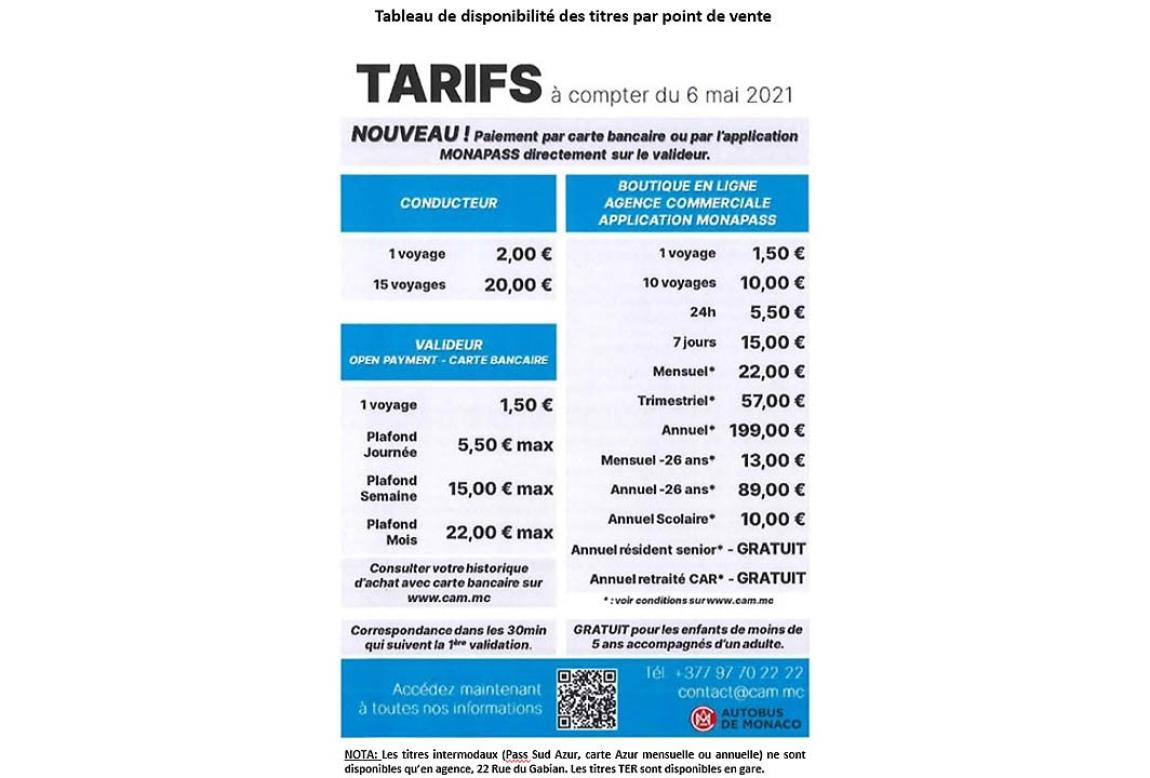 Cene prevoza v Monaku so odvisne od tega, kako dolgo uporabljate vozovnico. Ena vozovnica stane 1,50 EUR (oziroma 2 EUR, če jo kupite pri vozniku), 1-dnevna vozovnica z neomejeno vožnjo stane 5 EUR (velja tako na avtobusih kot z ladjo), 2-dnevna vozovnica pa 8 EUR.